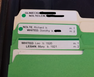 | Non-Direct line are filed behind original parent and then grandchildren filed. Used manilla folders with dot. See Tweaking round two for my new system. |
