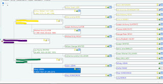 Color coding: I followed her suggestion and did one for each line of my grand parents. I followed adoptive lines. In the future as I get more on my biological grandfathers I will use orange and purple. I used black for resource files.